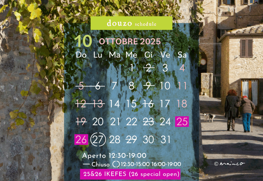 そんな人生のワクワクを、これからもイタリア雑貨とカレンダーやイタリア語はんこ、伏見ビルイラストなどのdouzoグッズ、グラフィックデザインなどのお仕事で沢山の方に伝染できたらこれ以上の喜びはありません。