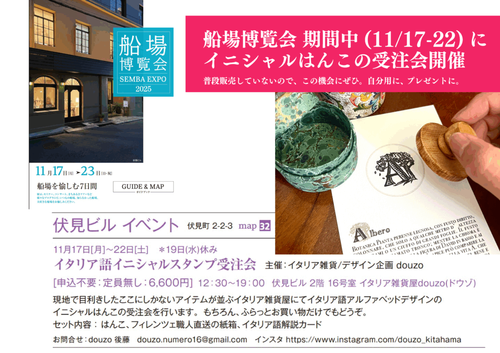当店では、イタリア語のアルファベットデザインを用いたイニシャルはんこの受注会を行います。フィレンツェの紙屋さんの箱に入れてお届け。